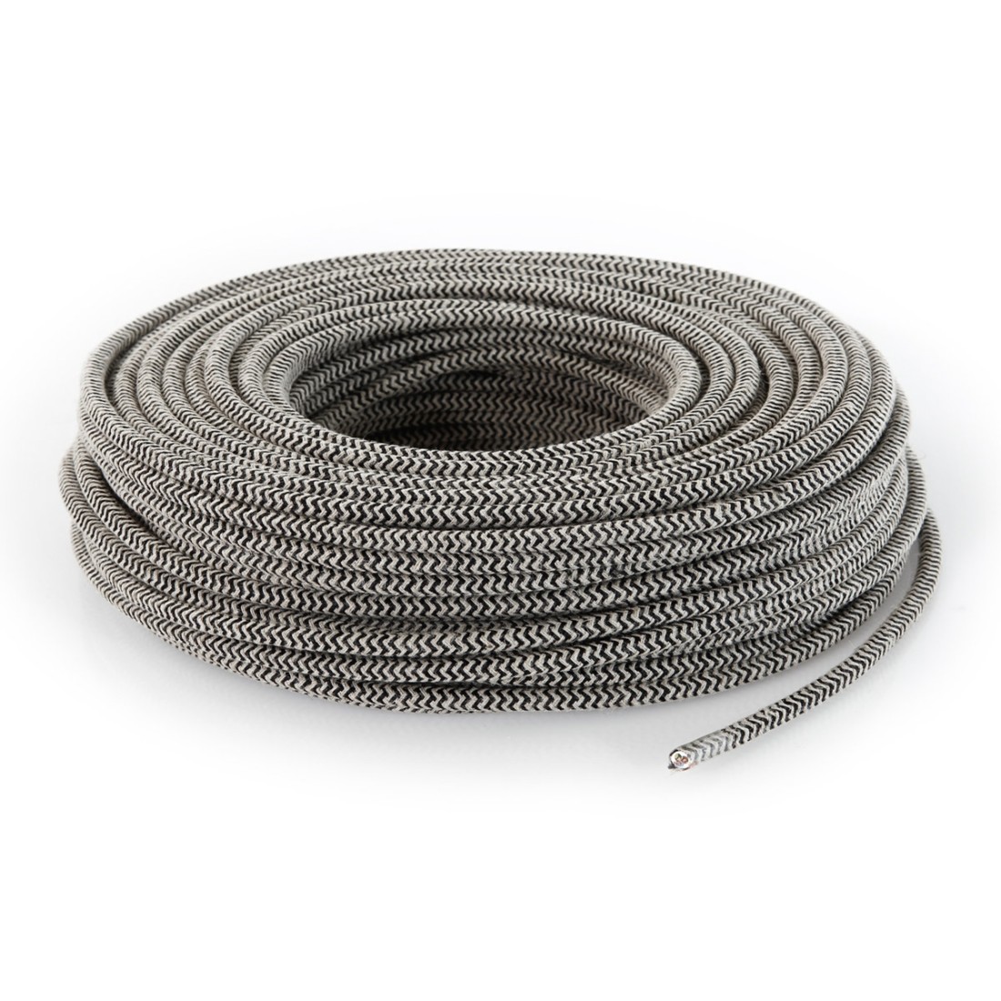 Rundes, farbiges textilummanteltes Elektrokabel aus Rohgarn in Sand und Schwarz.