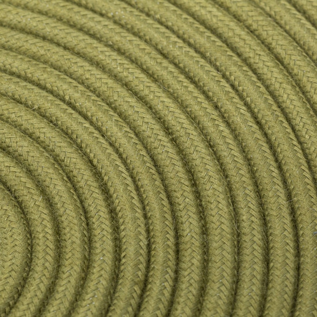 Cable eléctrico redondo revestido en tejido de hilo crudo de color oliva.