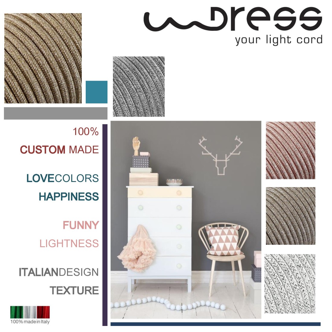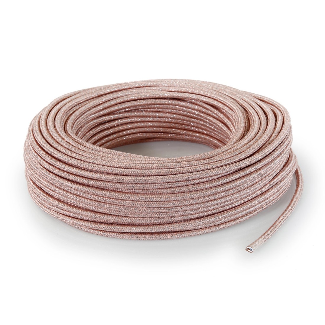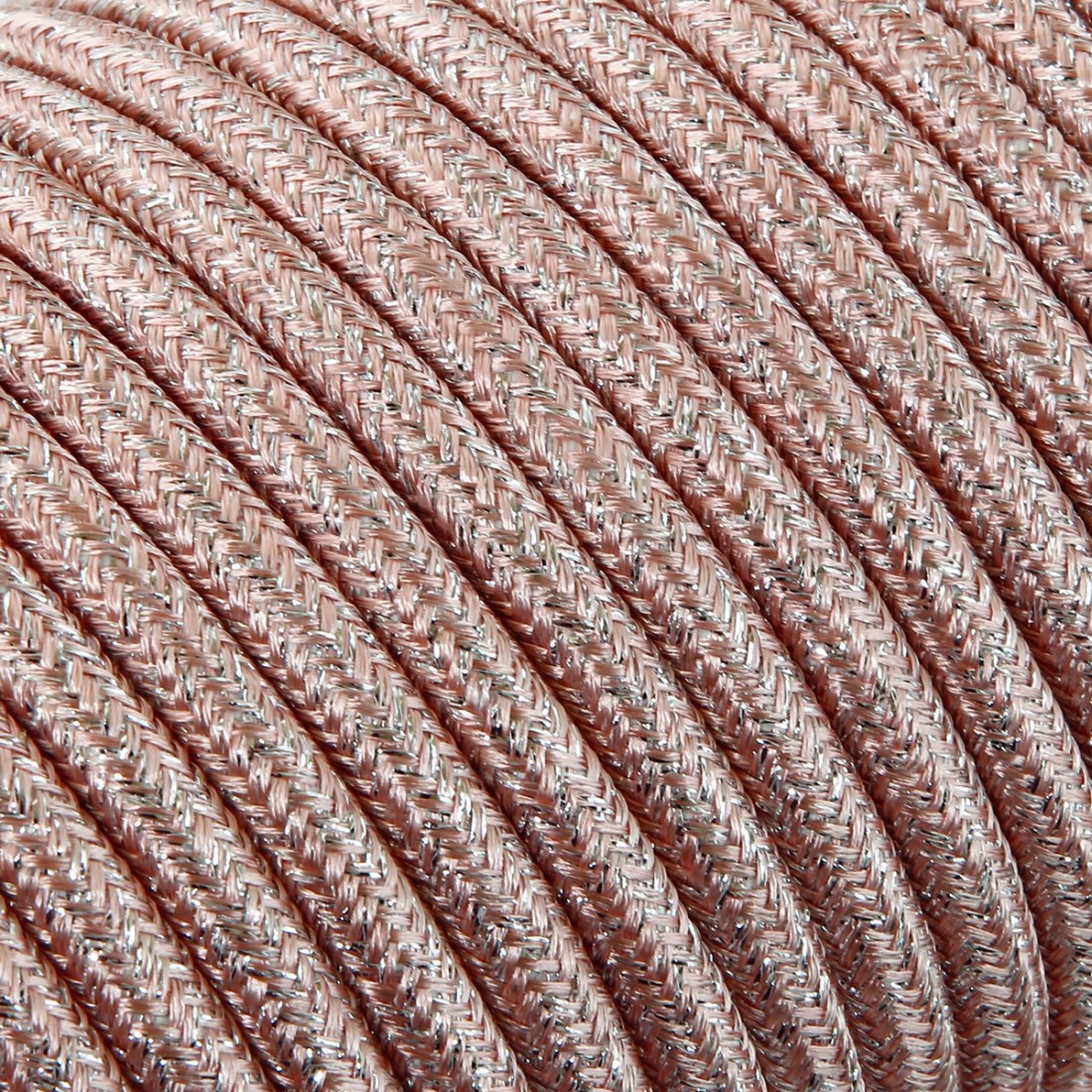 Cable eléctrico redondo revestido en tejido de color lamé rosa.