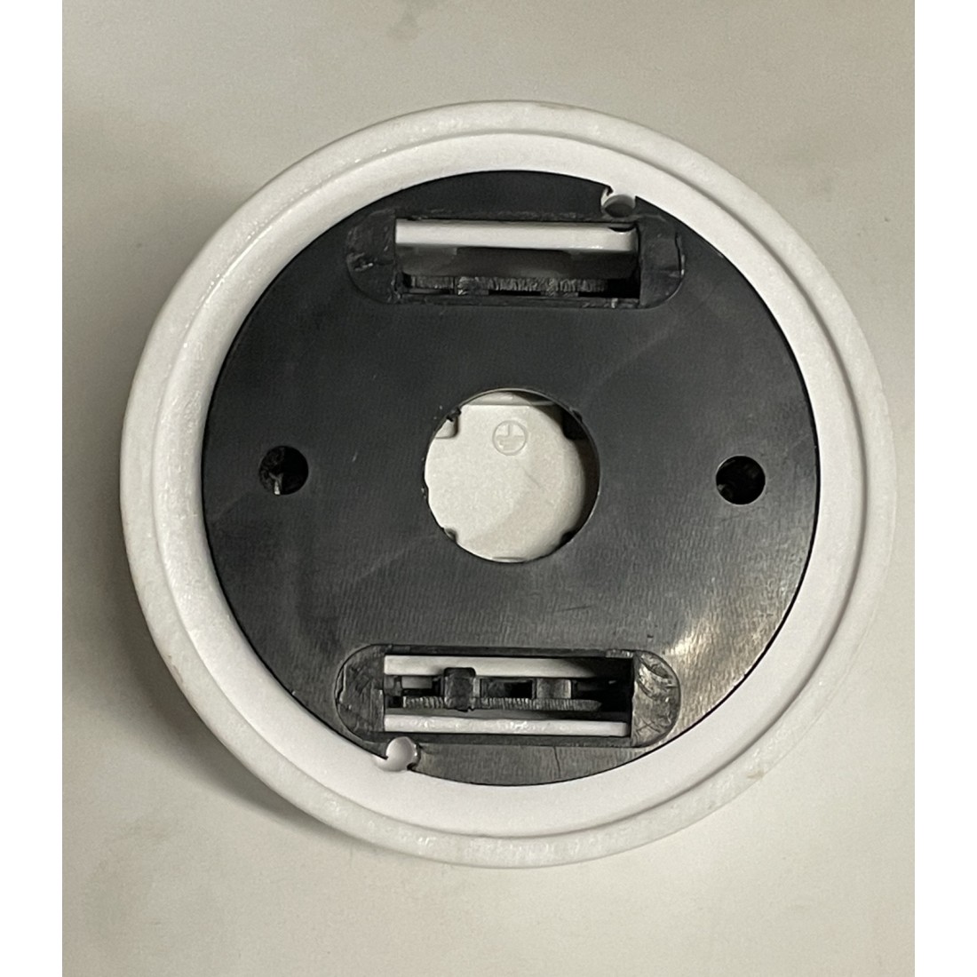 TOMA UNIVERSAL DE PORCELANA BLANCA CON BASE DE MADERA NOGAL