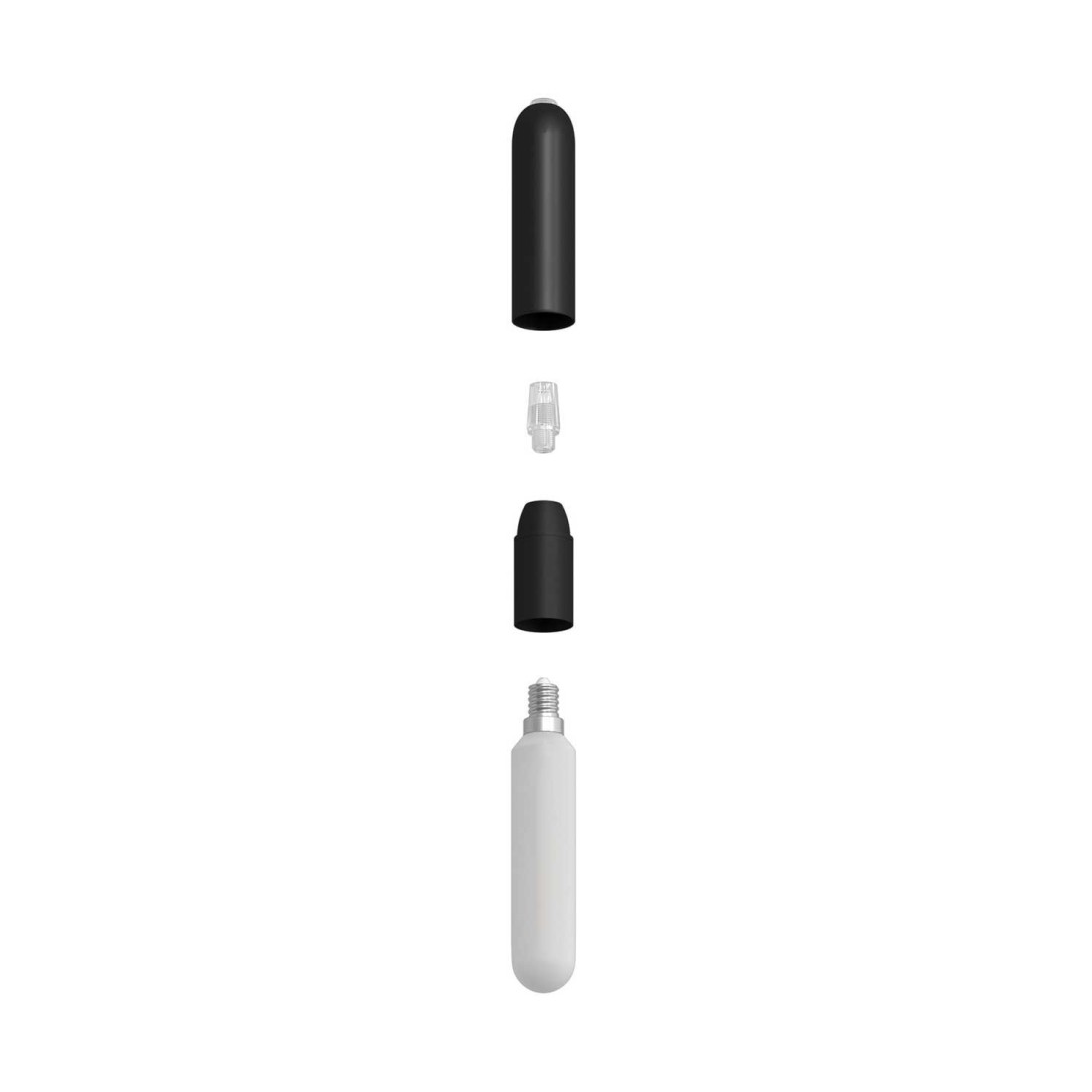 Cobertura de metal negro para portalámpara E14 y una prensa cables de material plástico.