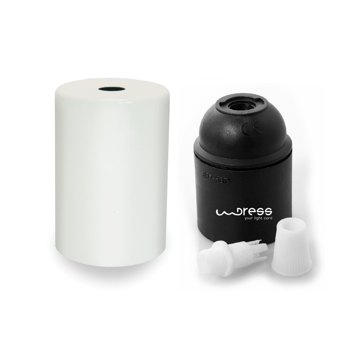 Cobertura de metal blanco para portalámpara E27 y una prensa cables de material plástico.