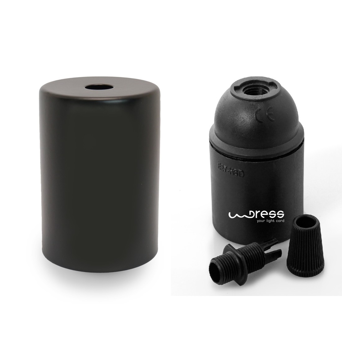 Cobertura de metal negro para portalámpara E27 y una prensa cables de material plástico.