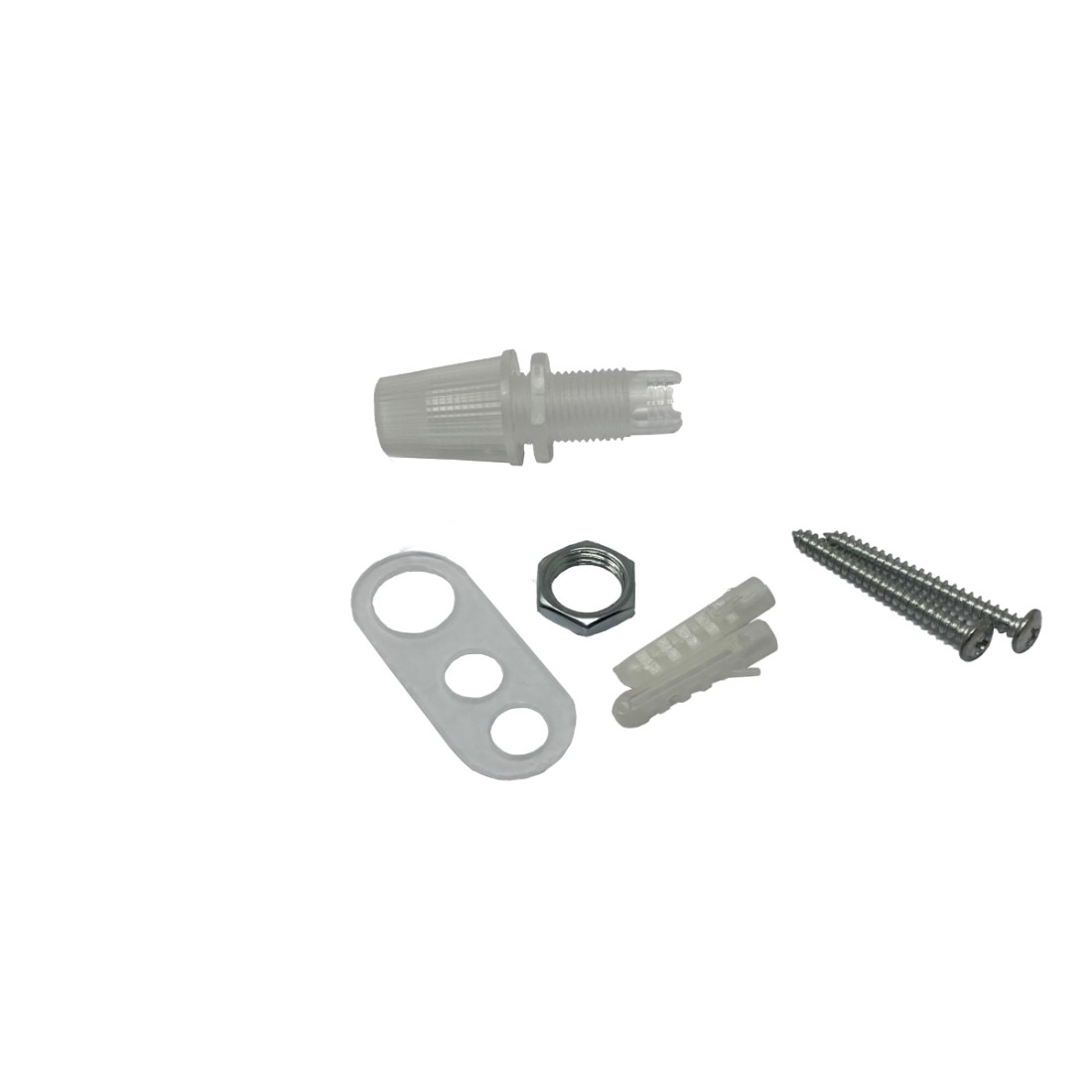En el paquete encontrarás 2 tornillos y 2 tacos para la fijación en pared, una prensa cables de material plástico, una tuerca y un tensacables.