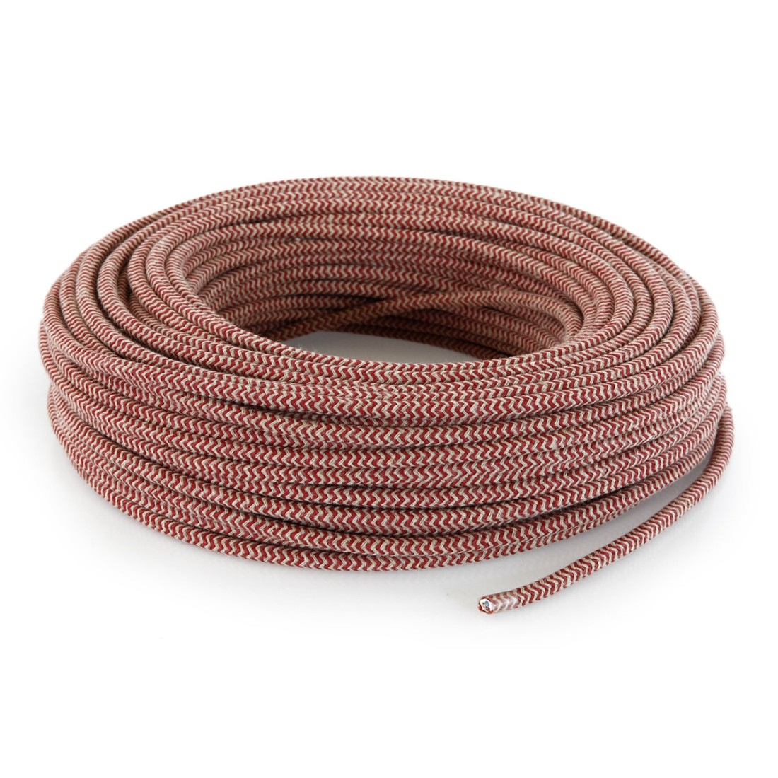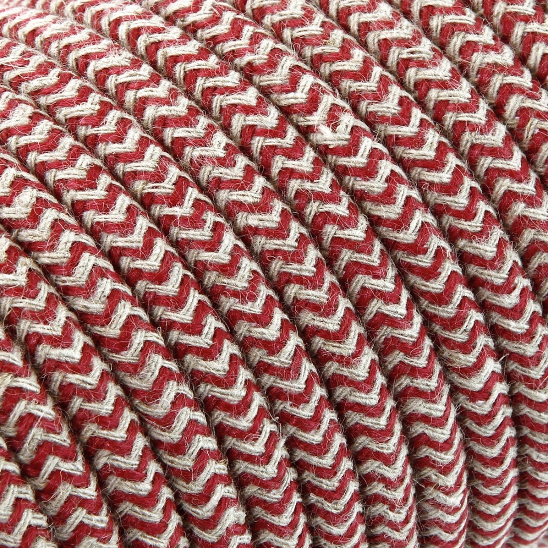 Câble électrique rond gainé de tissu fil brut coloré sable et cerise.