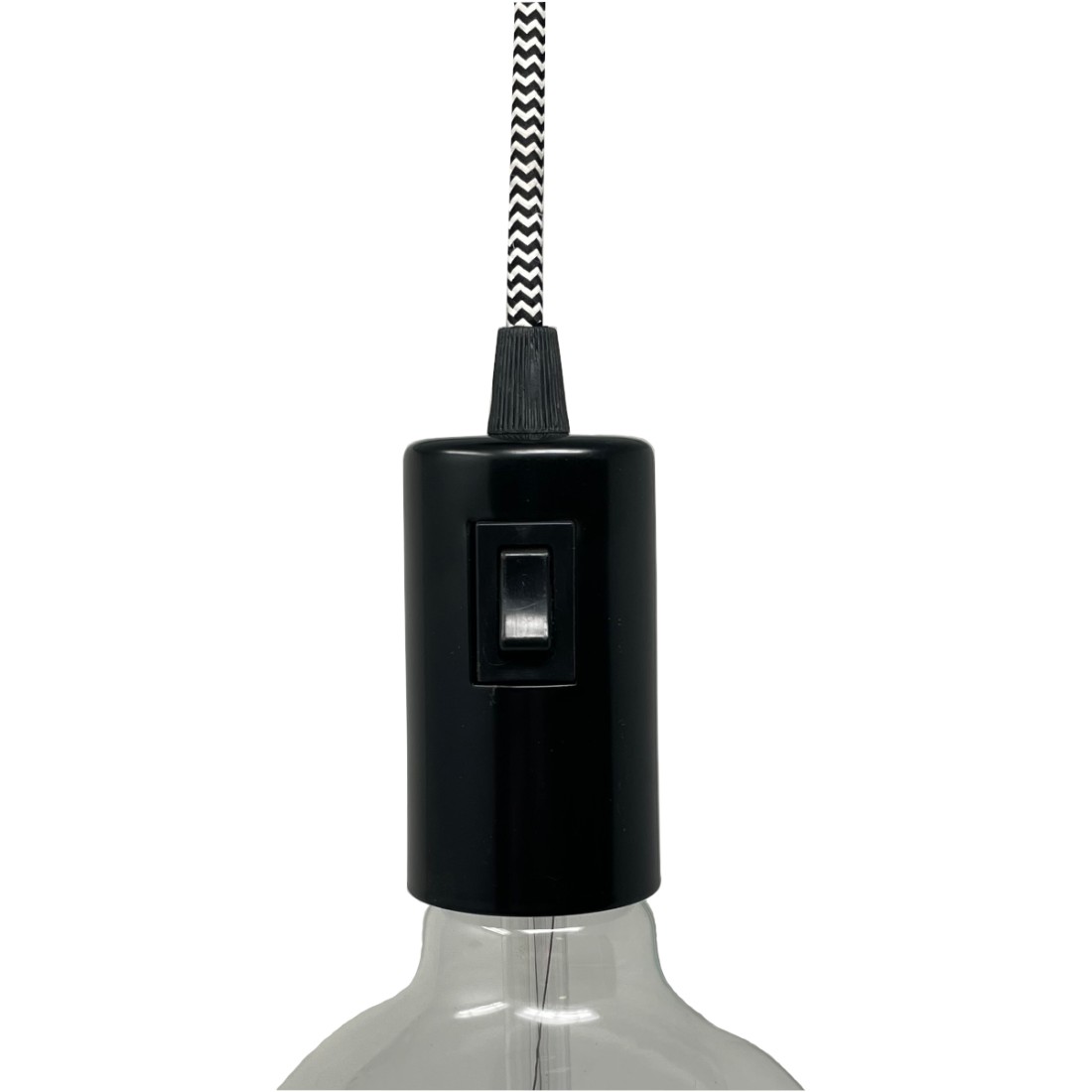 Cache en métal noir pour douille E27 avec interrupteur et un serre-câble en plastique.