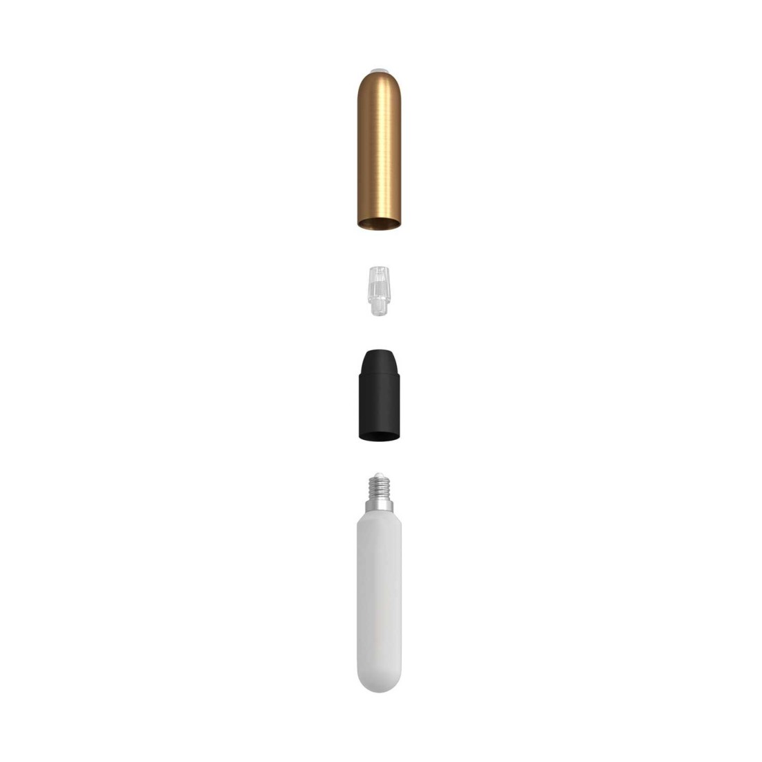 Cache en métal bronze satinè pour douille E14 et un serre-câble en plastique.