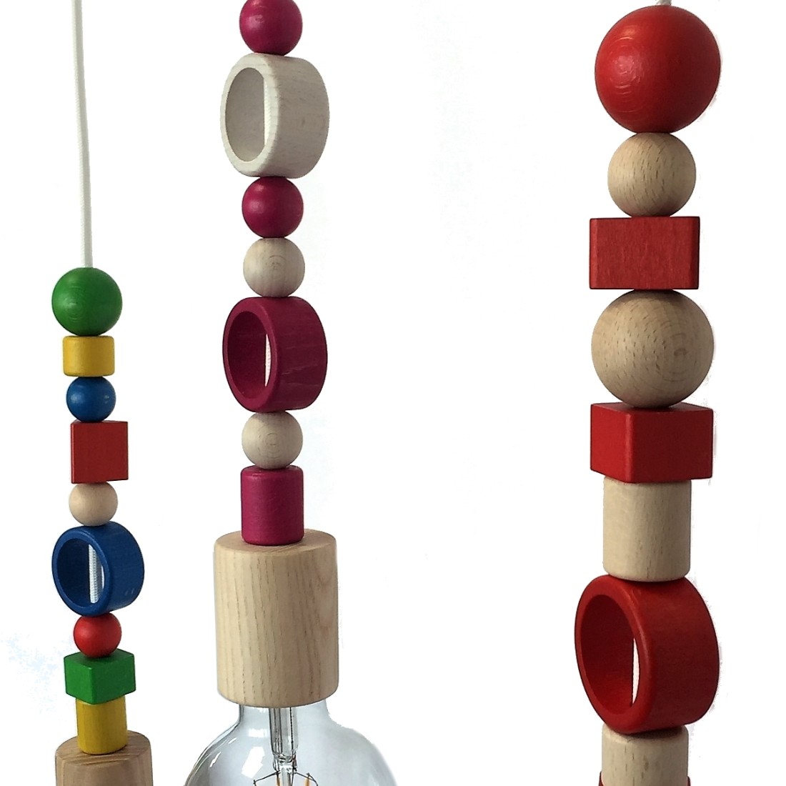 11 formes géométriques en bois blanc à enfiler sur le câble textile coloré pour personnaliser votre projet d’éclairage.
