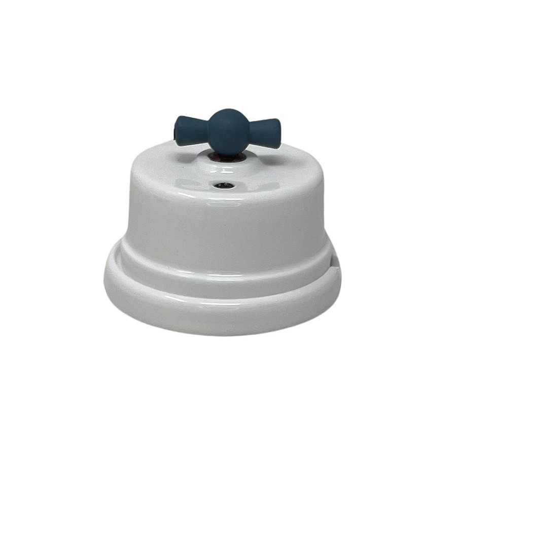 Interrupteur/Déviateur rotatif en porcelaine blanche avec bouton en bois peint.