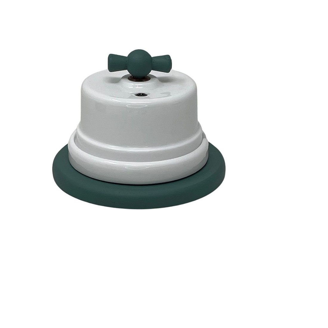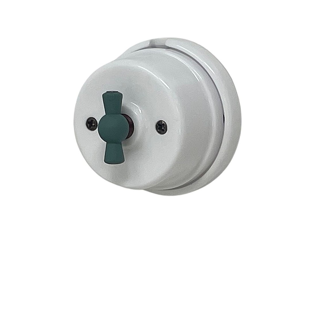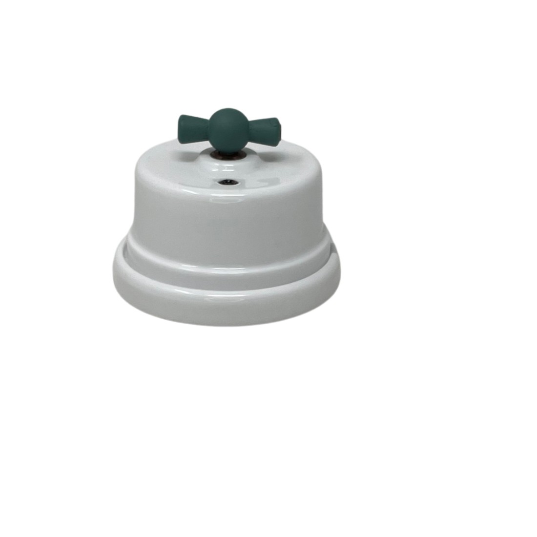 Interrupteur/Déviateur rotatif en porcelaine blanche avec bouton en bois peint.