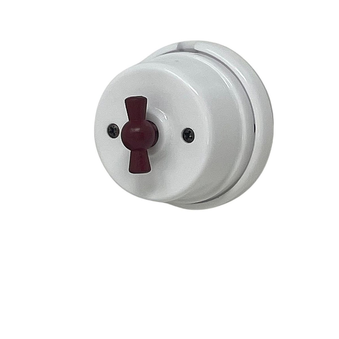 Interrupteur/Déviateur rotatif en porcelaine blanche avec bouton en bois peint.