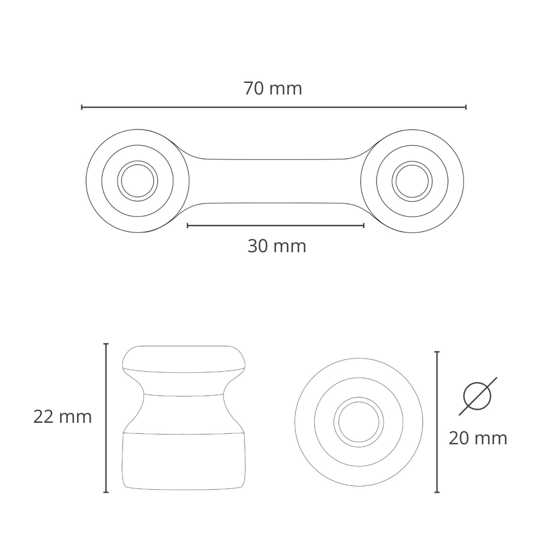 Isolateur en porcelaine double Ø 20 mm pour la fixation au mur ou au plafond des câbles torsadés.