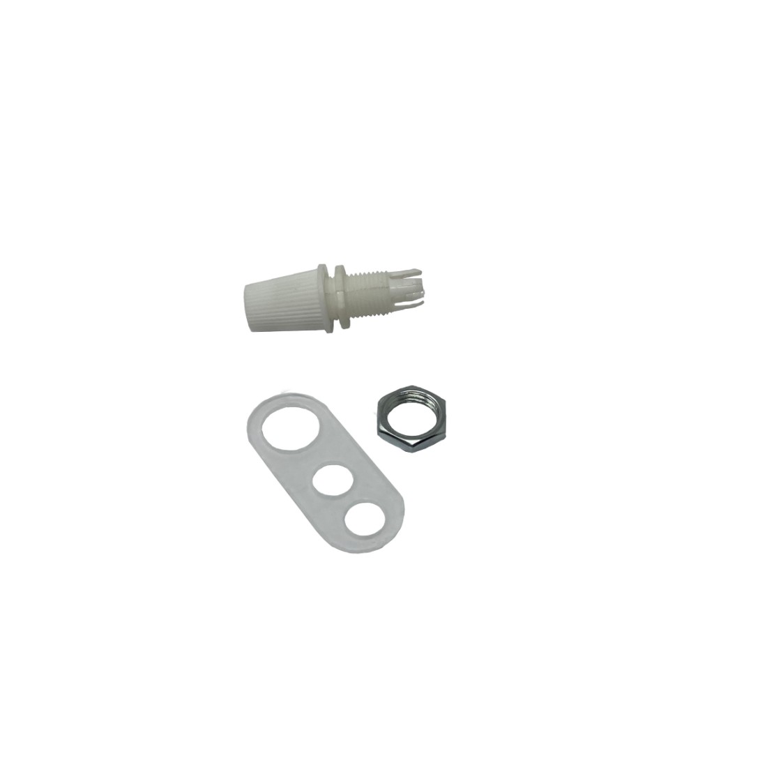 L’emballage contient un serre-câble en plastique, en écrou et una plaque de réglage du câble.