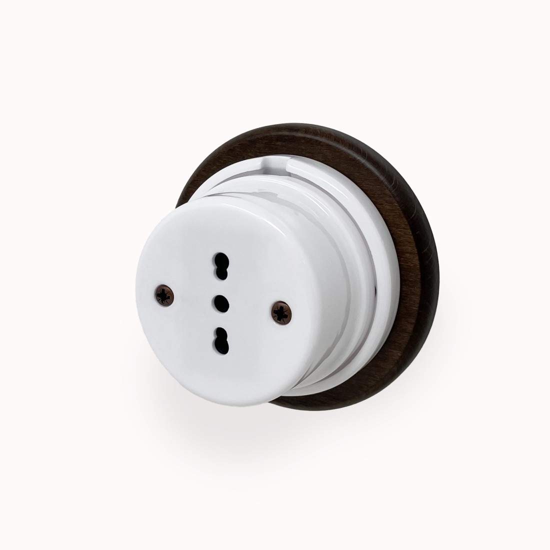 Presa 10/16A 2P+T Bipasso in porcellana bianca con base in legno noce