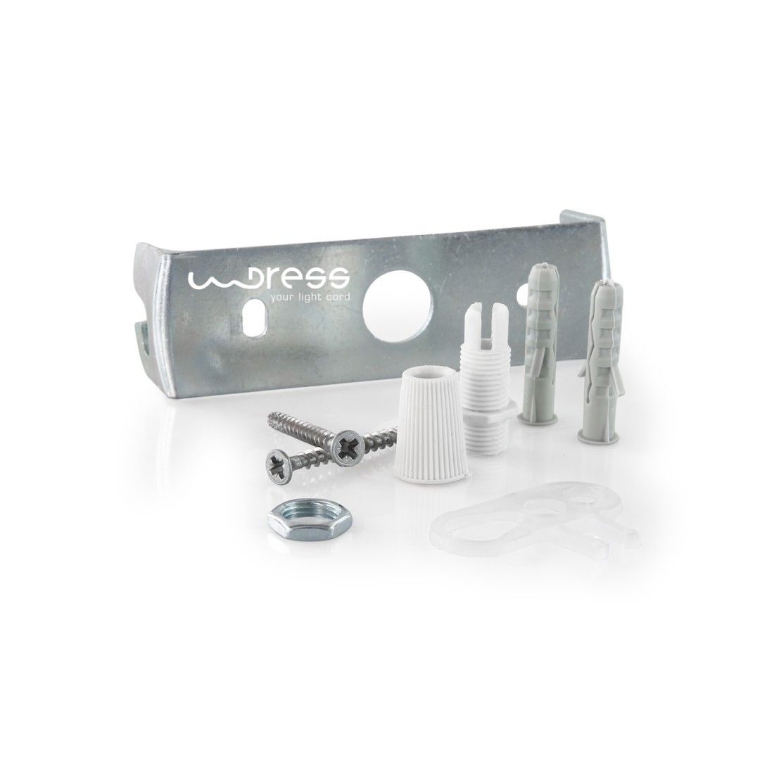 Nella confezione trovi la staffa con viti per il fissaggio a muro e un serracavo in materiale plastico.